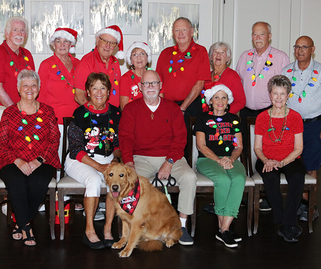 L-R: DAWN & STEVE VANDERHILL, AND KATHY & MIKE SCHMIDLKOFER. Colorful seasonal outfits in red...
