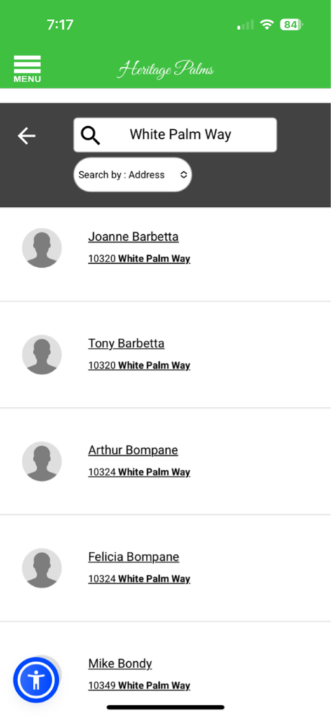 Our current online Directory DOES allow you to search by name AND address. Go to https://www.hpgcc.com/Roster/Roster.aspx. At the top of the “Club Roster” page there is a “search” option which includes Name and ADDRESS. It defaults to name when opened, so you have to change the search option to “address.” Then simply type in the specific address or the street you’re looking for. See below…