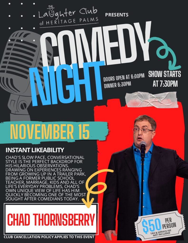 The Laughter Club is hosting Chad Thornsberry on November 15 in the Palms Dining Room. Doors open at 6 p.m., with dinner served at 6:30 p.m. Price is $50 per person. Simply sign up on our website’s Club Calendar or at the Hostess Desk.