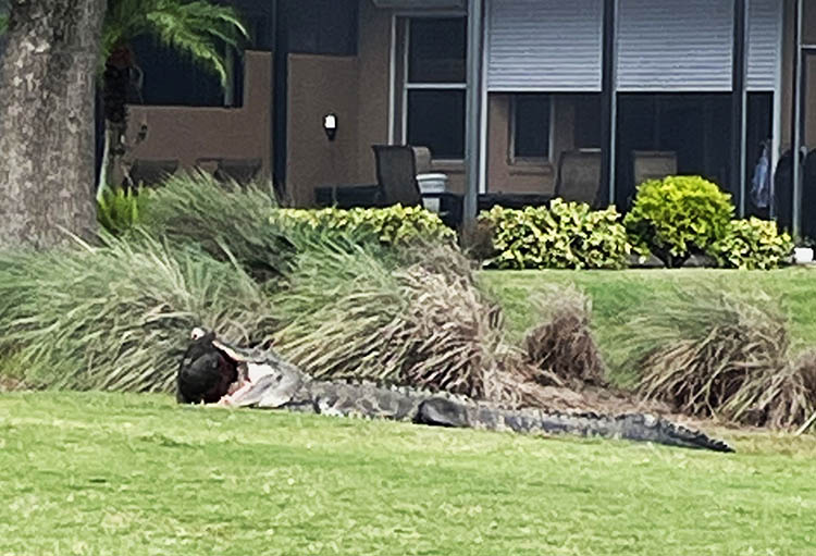 From Vicky Sorensen: I was in a foursome playing Royal 11 on Saturday, October 25. We came across this large alligator near the pond by the green munching on a turtle. Kelly Vecere was brave enough to shoot this photo!