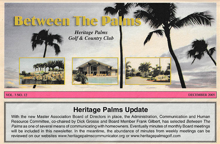As noted in the inaugural issue of BTP by Dick Grosse, then Co-Chair of the Communication Committee in 2005, “The Board has authorized the Communications Committee to proceed with a monthly newspaper, Between the Palms. This newspaper is published by Seabreeze Communications Group, a company that specializes in mailing community association newspapers to the owners. Seabreeze generates its revenue by selling advertising.” Then, as now, there was absolutely no cost to Heritage Palms for this amenity.