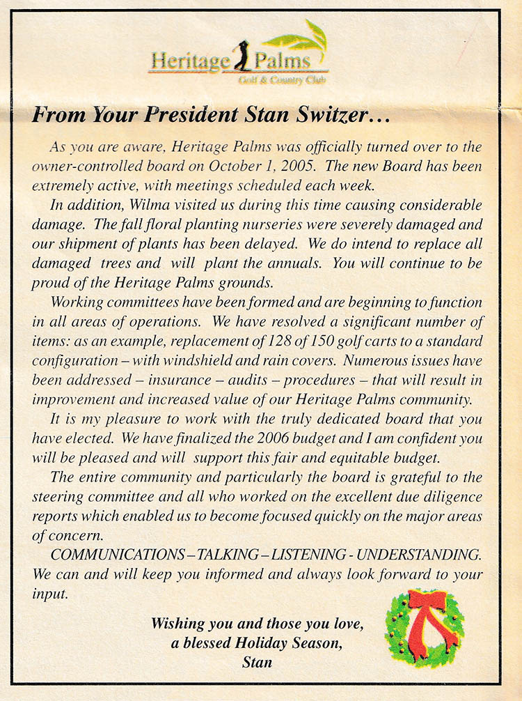 THAT “HERITAGE PALMS WAS OFFICIALLY TURNED OVER TO THE OWNER-CONTROLLED