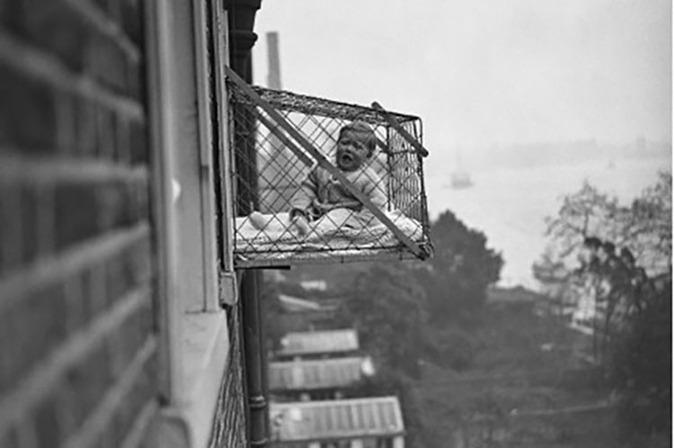 Enter the baby cage — a wire enclosure fastened to an open window, which allowed apartment dwellers to suspend infants several stories above city streets to “air them out.” The first U.S. patent was granted to Emma Read of Spokane, Washington in 1922, though the idea had circulated earlier. The baby cage briefly caught on, notably among members of the Chelsea Baby Club in London. Even Eleanor Roosevelt used one for her infant daughter, Anna, until a horrified neighbor threatened to call the New York Society for the Prevention of Cruelty to Children. Baby cages declined in the second half of the 20th century, largely due to safety concerns.