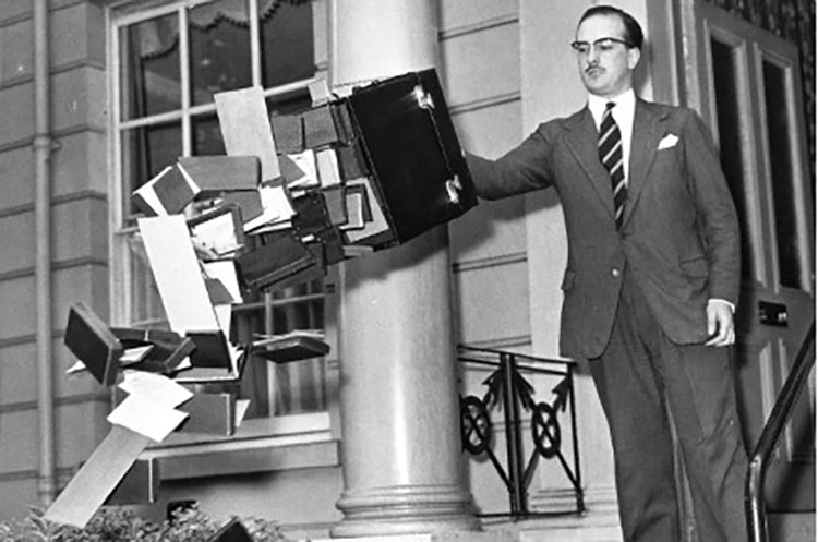 In the 1950’s and ’60s, inventors sought clever ways to foil thieves — and few were as dramatic as the Anti-Bandit Bag. One of the most famous versions was debuted by French Canadian inventor John H. T. Rinfret in 1963. Rinfret, inspired by his own experience of being robbed, designed a bag with a spring-loaded handle, which enabled the carrier to launch the bag’s contents all over the place in the event of a robbery. Other anti-bandit bags spewed smoke and dye or triggered shrieking alarms when snatched. One model, aptly named the “Arrestor,” clamped onto the thief’s hand and blasted out three 12-foot telescoping metal rods, preventing the robber’s escape. None of these designs reached mass production, likely due to their unwieldiness, dubious efficacy, and potential to be triggered accidentally