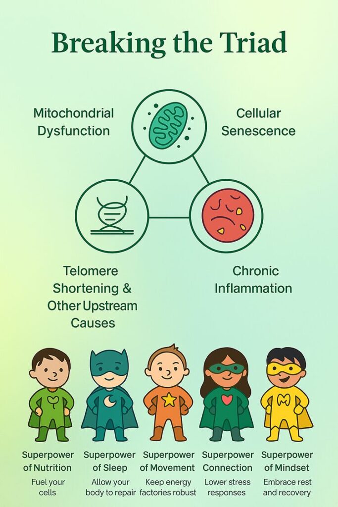 Chronic stress floods the body with cortisol, which disrupts mitochondrial energy production. Healthy relationships, laughter, community (like the one here at Heritage Palms), and emotional support reduce this load and promote resilience.
