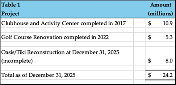 One important point about Table 3: it reflects available sources as of December 31, 2025. The Club will continue to receive resale capital contributions in 2026 and in future years. In addition, it is likely that some operating surplus funds will be allocated to the projects. This is especially relevant because the final Oasis/Tiki cost has not yet been determined and may exceed initial estimates. Construction projects and original budgets are not always close friends.