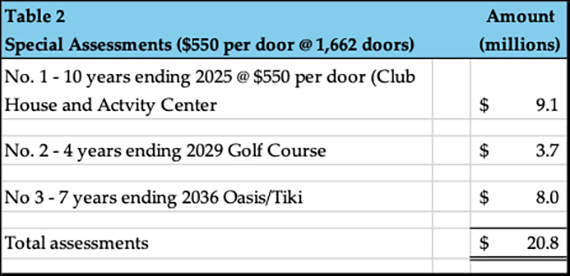 So how are we paying for these new amenities? As everyone knows, the membership approved three separate special assessments, as shown below. In other words, this wasn’t done quietly in the back office. The membership voted, and the membership is funding it.