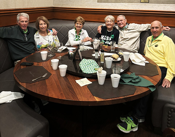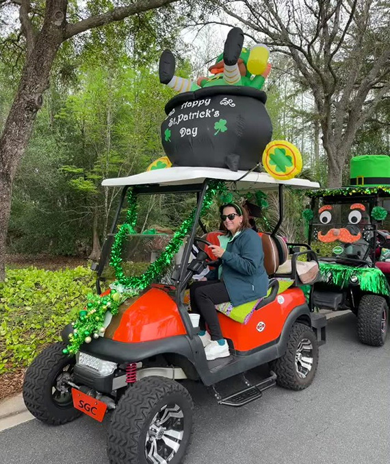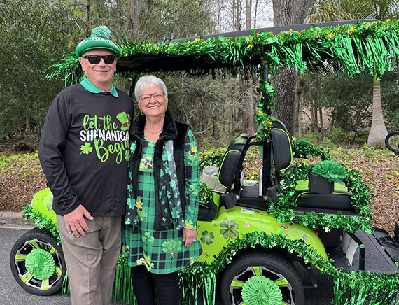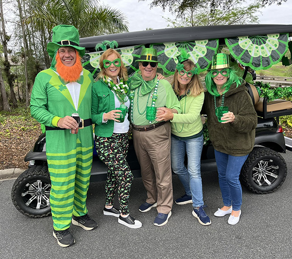 Heritage Palms kicked off its St. Patrick’s Day celebration with a parade of 20 or so golf carts decorated in a myriad of green colors to commemorate the holiday. They traveled up Wine Palm and onto Washingtonia Palm before arriving at the Clubhouse. Due to the cold weather, the St. Patrick’s Day festivities continued in the Palms Dining Room and Grill Room.