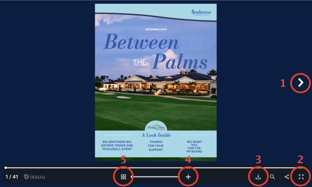Speaking of navigation, please know there’s an option for you to download this issue (or any prior issue) as a PDF (Adobe) for viewing, rather than using a web browser for viewing. Simply click the downward arrow icon (#3 below) to download the magazine as a PDF on your laptop, iPad, or cell phone. The PDF version shows one page at a time (vs the two pages you see side by side “on line”). Plus, if you download the issue, you can print any page you like, and also store any current or prior issue on your laptop. It’s easy-peasy!